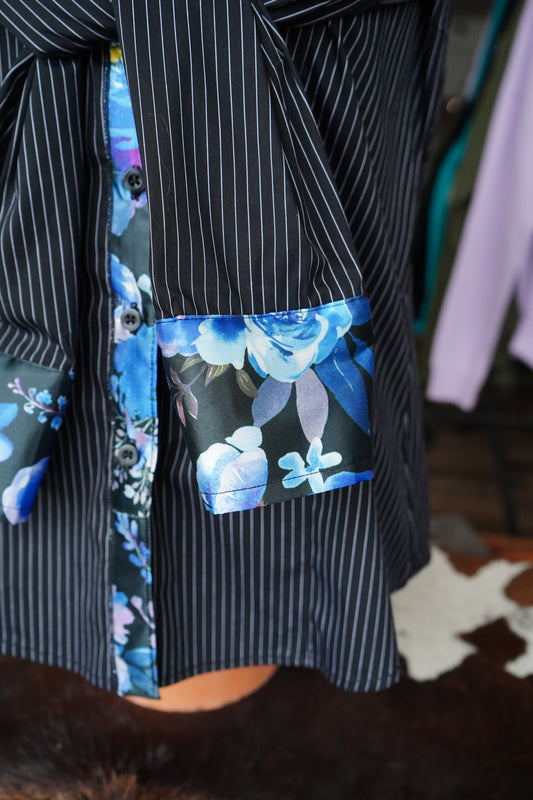 L - Watercolor Blue Floral on B/W Striped Cotton Button Down