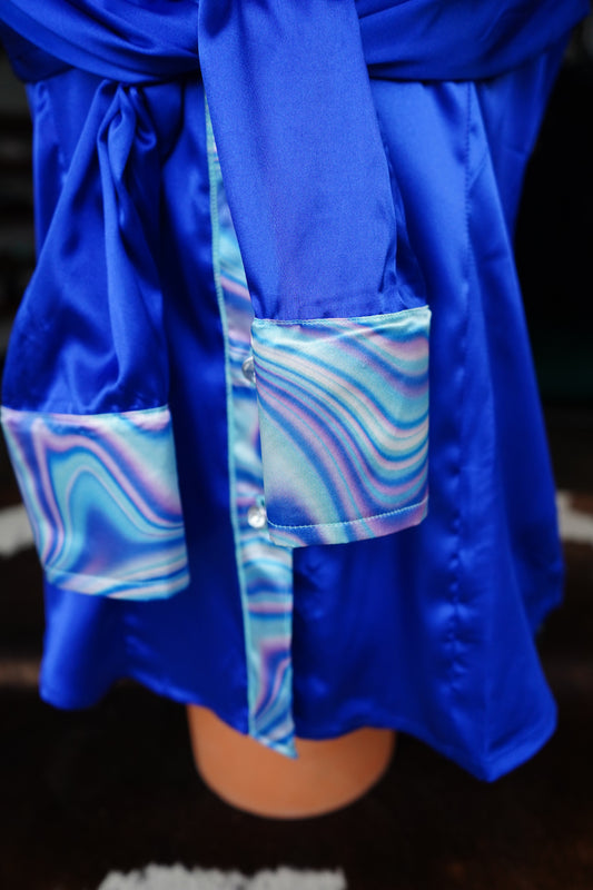 L - Light Pink n Turq Oil Spill on Royal Blue Satin Button Down