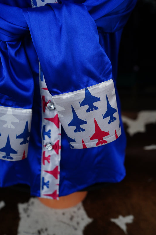 S - Military Planes on Royal Blue Satin Button Down
