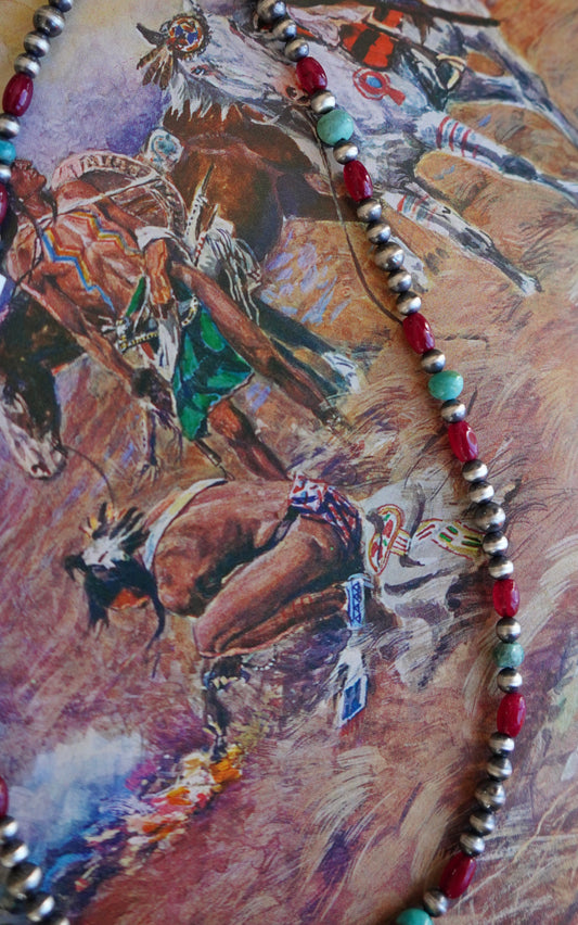 Sterling Silver Pearls w/ Red Coral & Turquoise Necklace - 16”