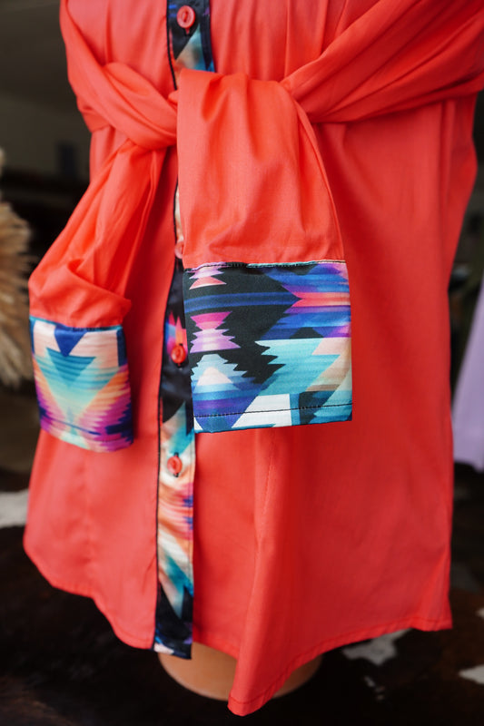 XL - Kaleidoscope Aztec on Hot Coral Cotton Button Down