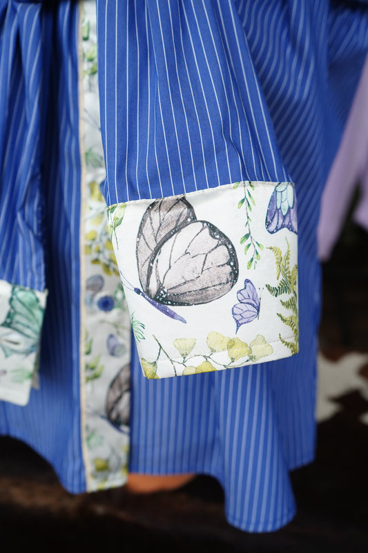 XL - Butterflies & Leaves on Denim & Blue Striped Cotton Button Down