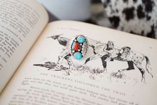 Vintage Turquoise & Red Coral Mens Ring - Sz 11