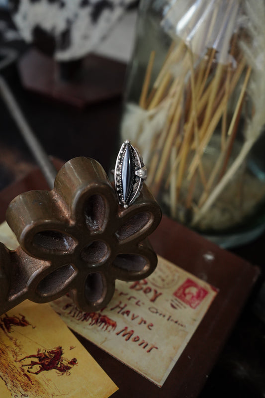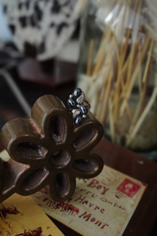 Vintage 2 Stone w/ Silver Flower Black Onyx Ring - Sz 5.5