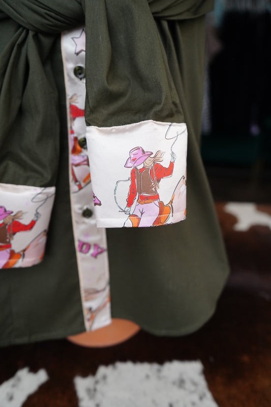 XL - Pink Howdy Gal on Olive Cotton Button Down
