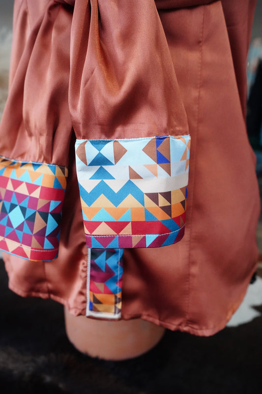 M - Turquoise Aztec Steer Heads on Emerald Satin Button Down