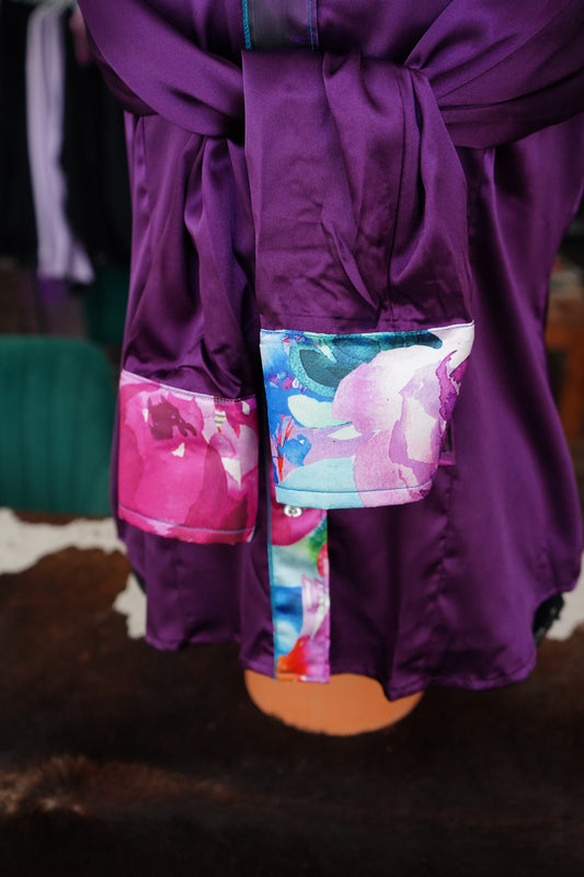 L - Watercolor Floral on Purple Satin Button Down