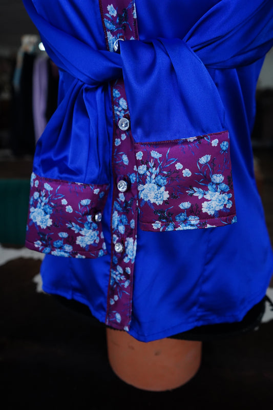 S - Burgundy & Blue Floral on Royal Blue Satin Button Down