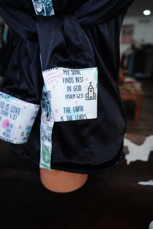 S - Faith Patches on Black Satin Button Down