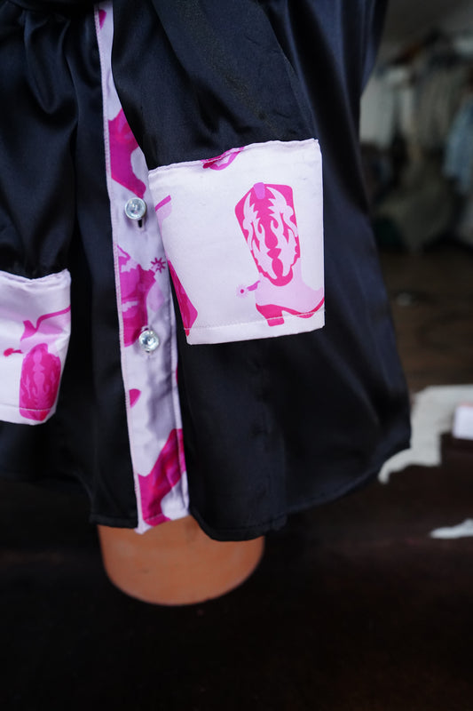 L - Pink Boot Goofin on Black Satin Button Down
