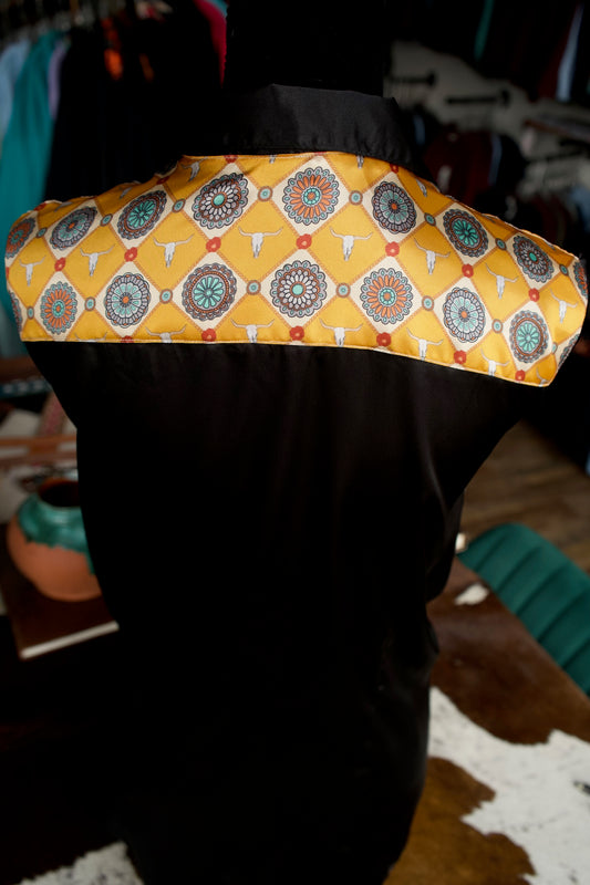 3XL - Mustard Steer Skulls & Concho’s on Black Button Down