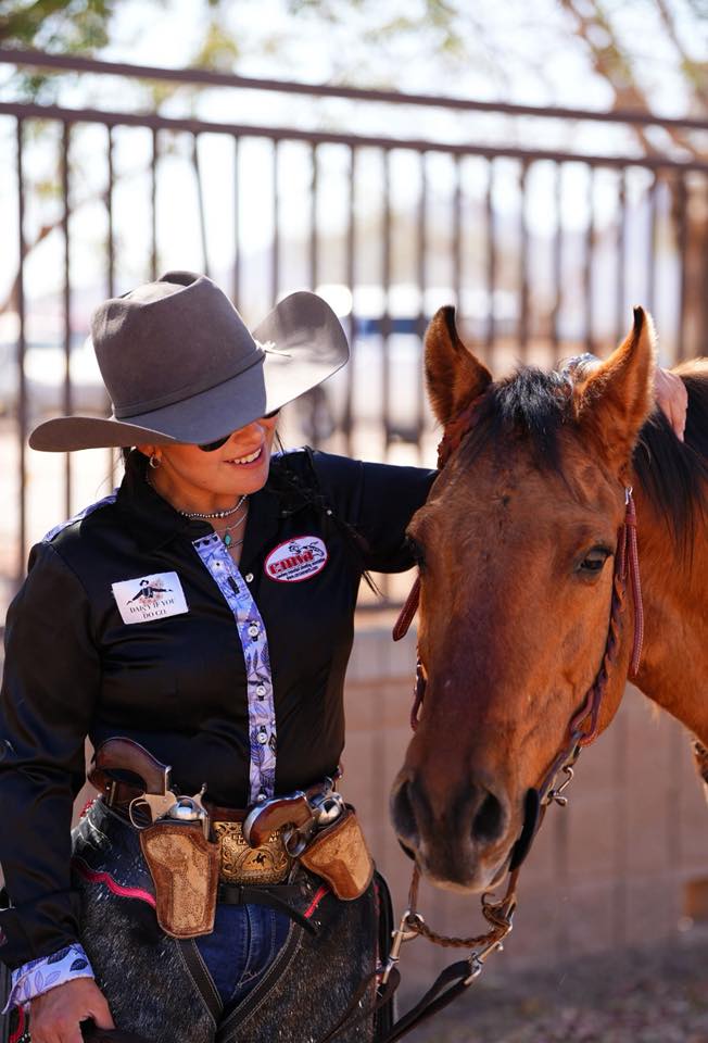 Hi everyone! My name is Tammy Knopp; I am 23 years old from San Diego, CA. I compete in Cowboy Mounted Shooting with my best buddy Cisco Sanchez. 2026 is going to look a little different for me as in July of 2025 Cisco and I had a fall which resulted in him suffering from 4 fractured to his accessory carpus bone. Outside of the arena, I work in fine jewelry manufacturing and wholesale as well as making custom lariat halters! Daisy if You Do Co has been a huge part of my life for the last 6 years; offering me life long friendships and one of a kind pieces that help me stand out in the arena. My favorite items are their turquoise, perfumes, and of course their button downs! Remember to shop small and pray hard