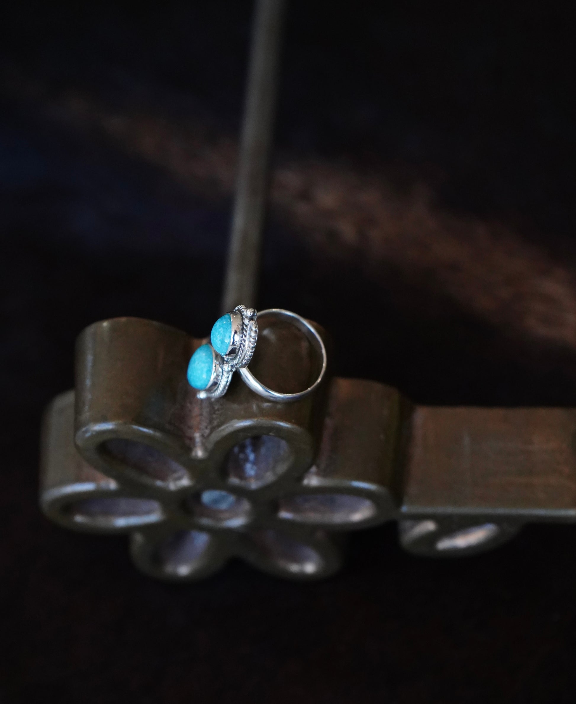 2 Stone Turquoise w/ Silver Feathers Ring - Sz 8