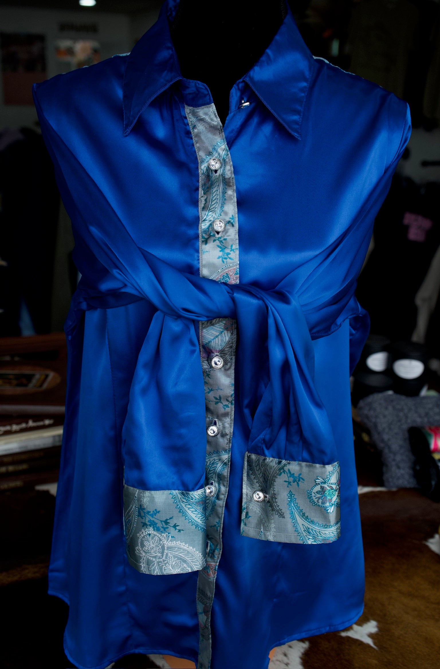 2XL - Gray Boho Paisley on Blue Satin Button Down