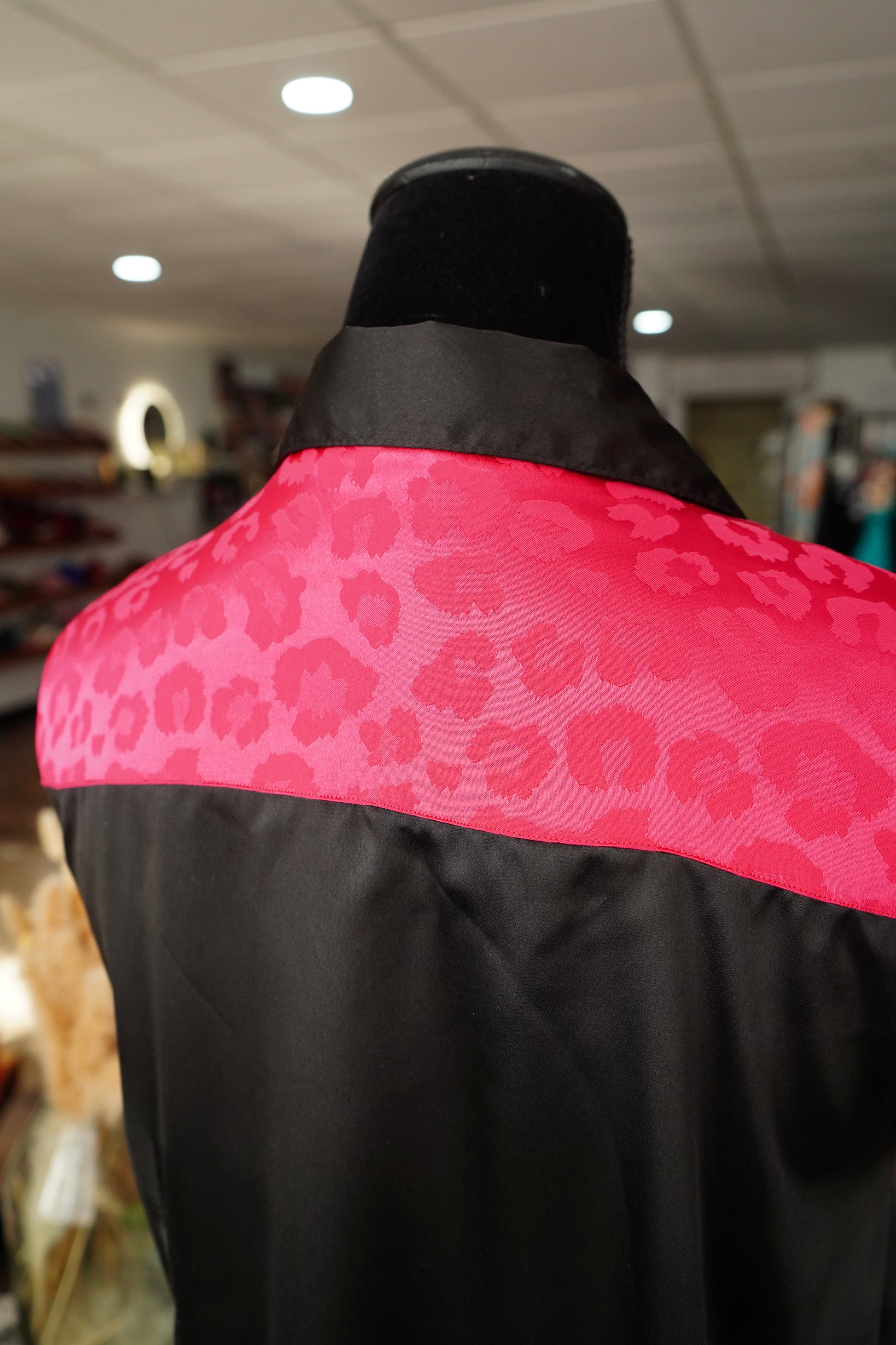 3XL - Hot Pink Cheetah Jacquard on Black Satin Button Down