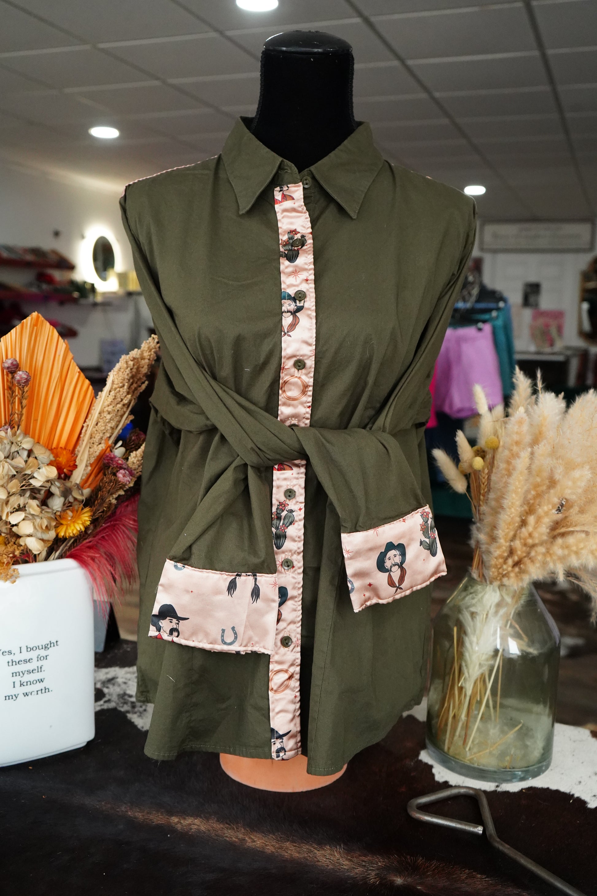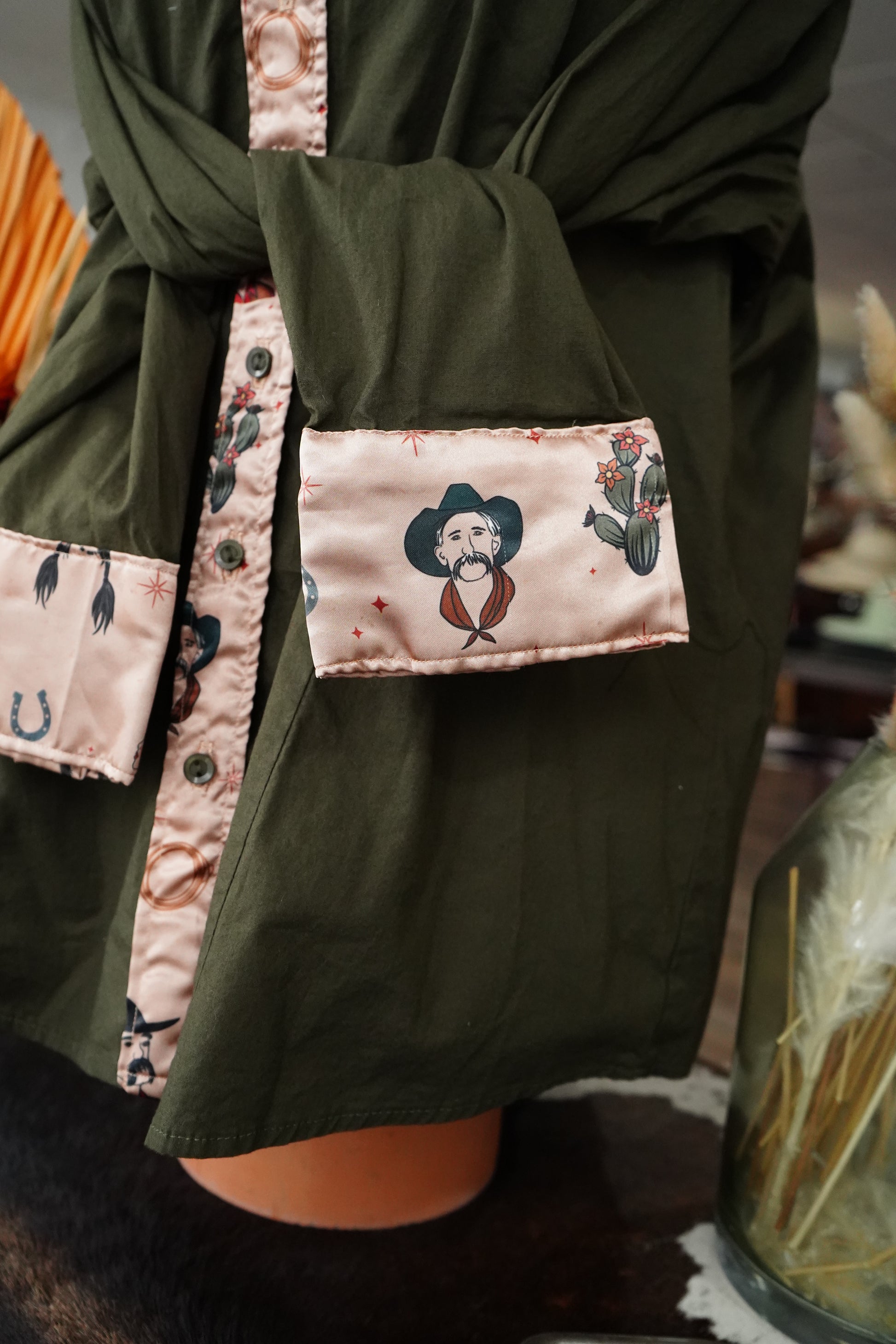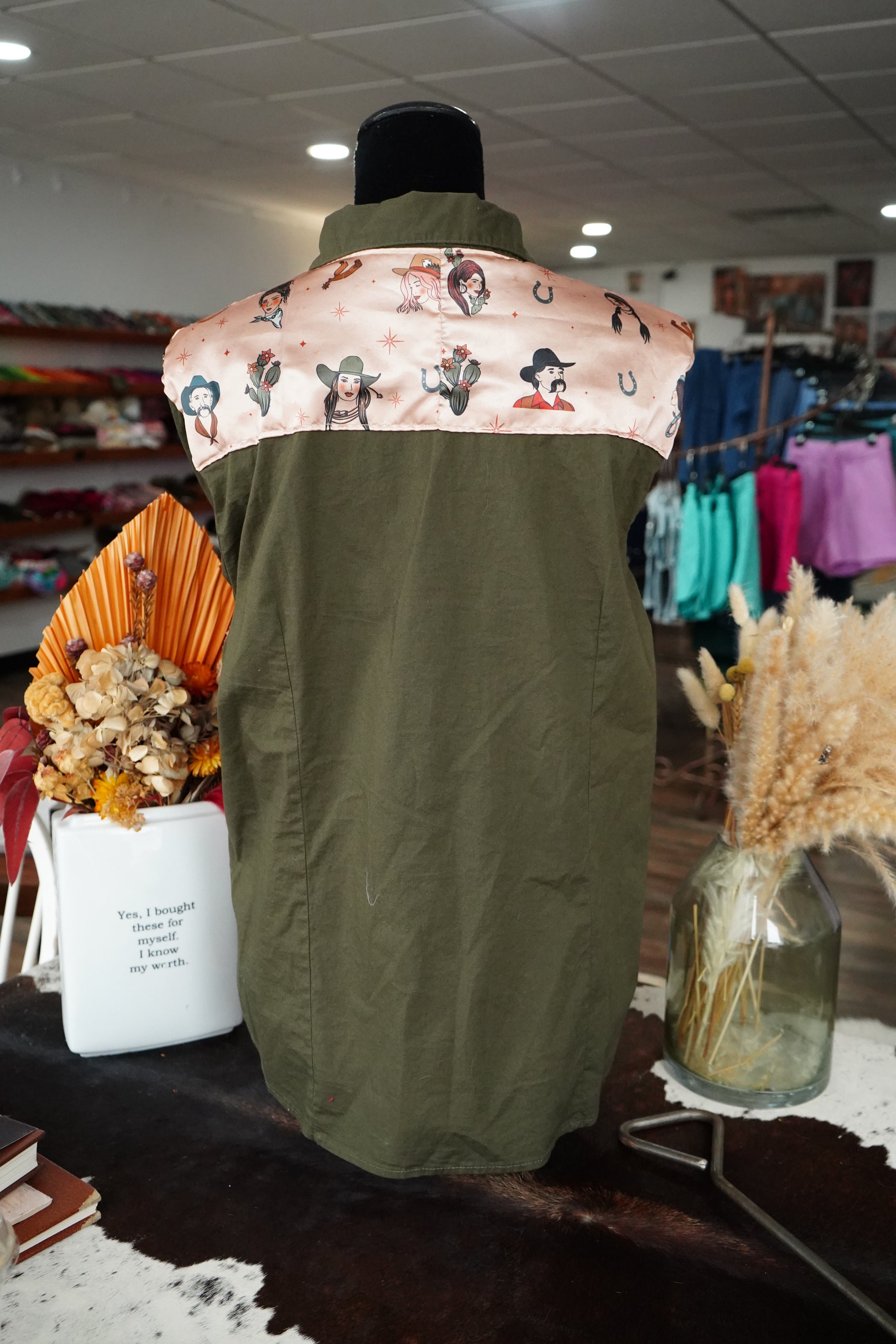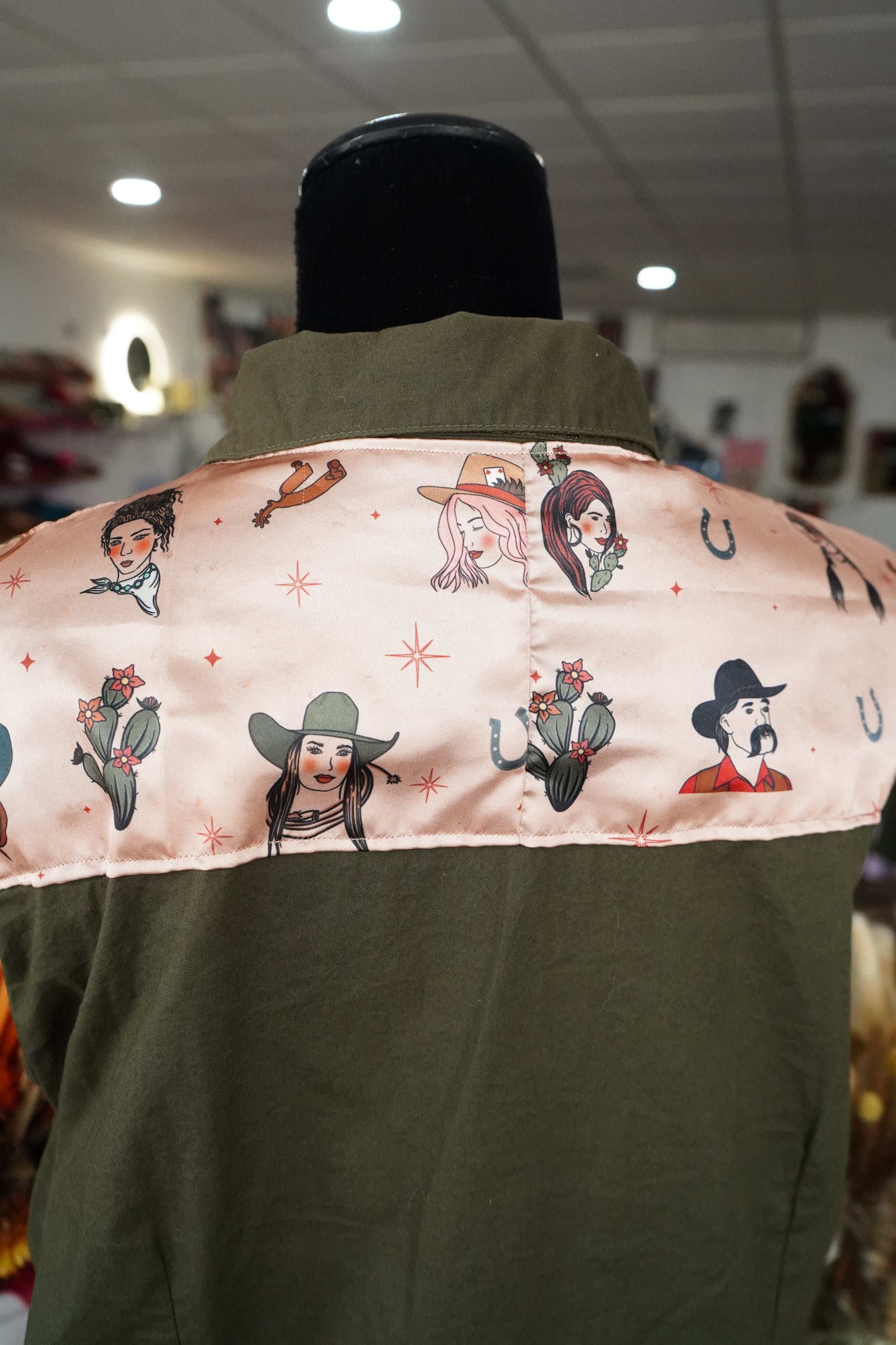 3XL - PRE-LOVED Western Drawings on Olive Cotton Button Down