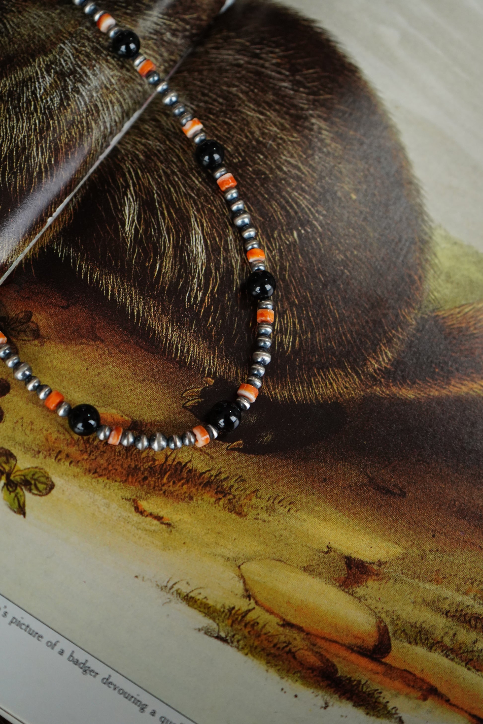 Black Onyx & Orange Spiny Sterling Silver Pearls Necklaces