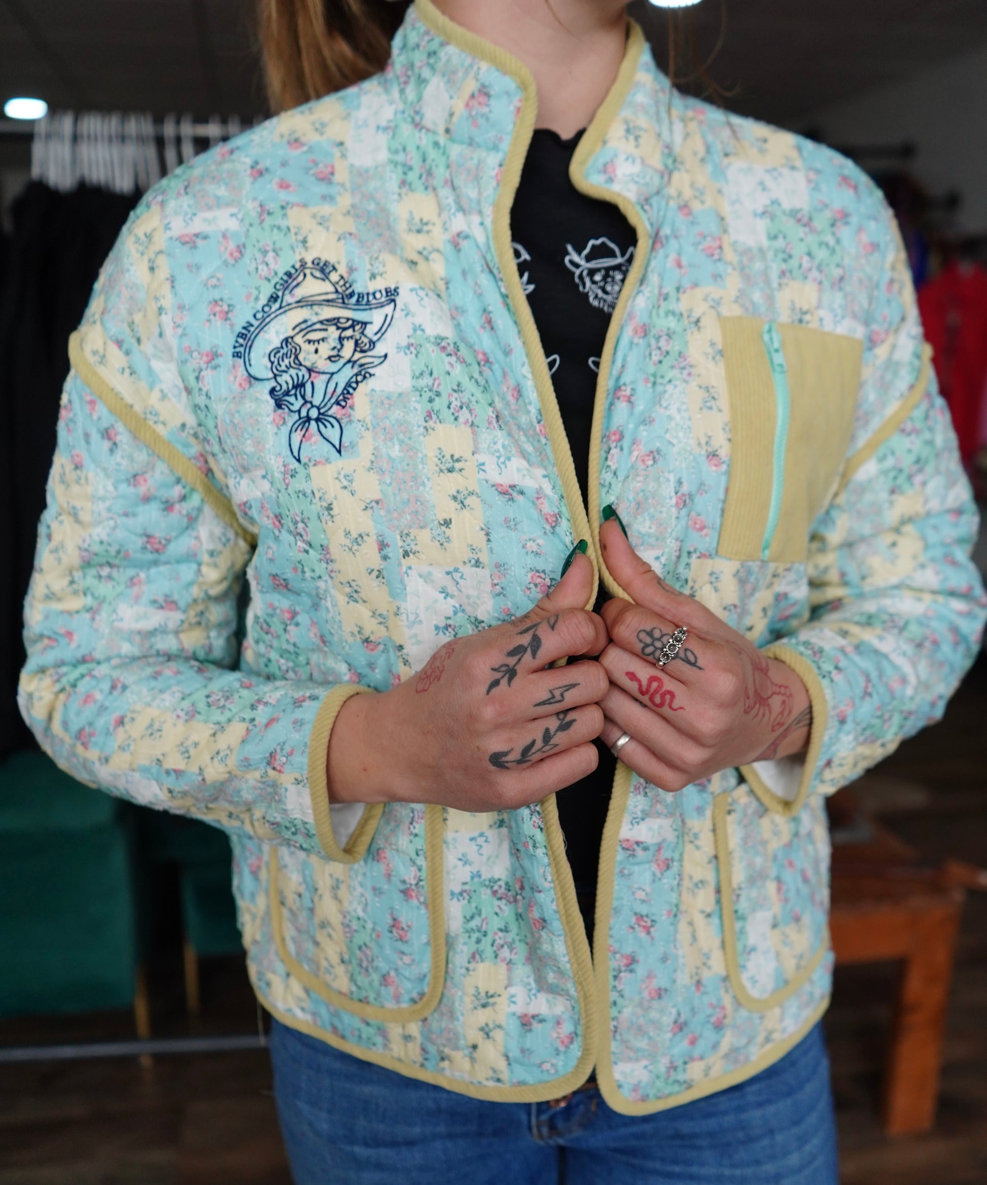 Cowgirls Cry - Embroidered Mint Lemon Quilted Patchwork Jacket