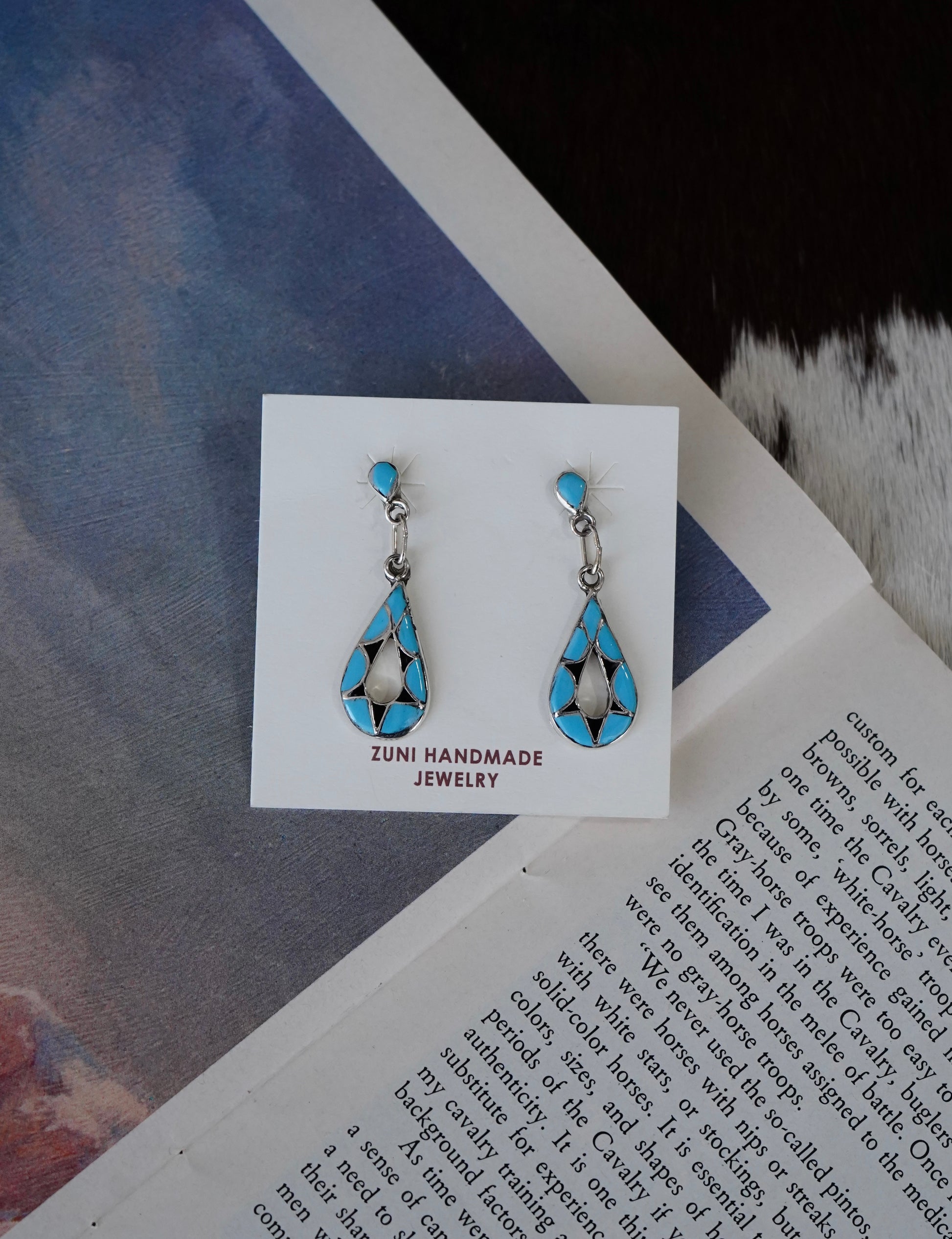 Emma Bowakaty Zuni Inlay Turquoise & Black Onyx Dangly Teardrop Stud Earrings