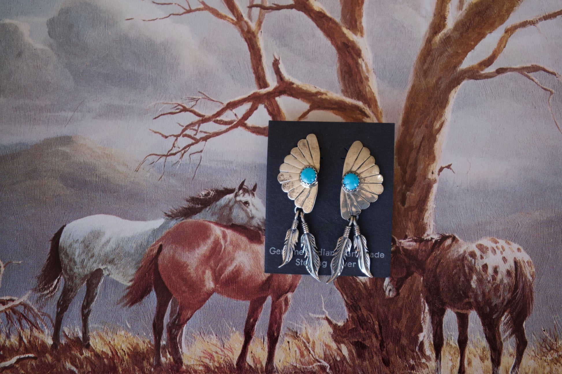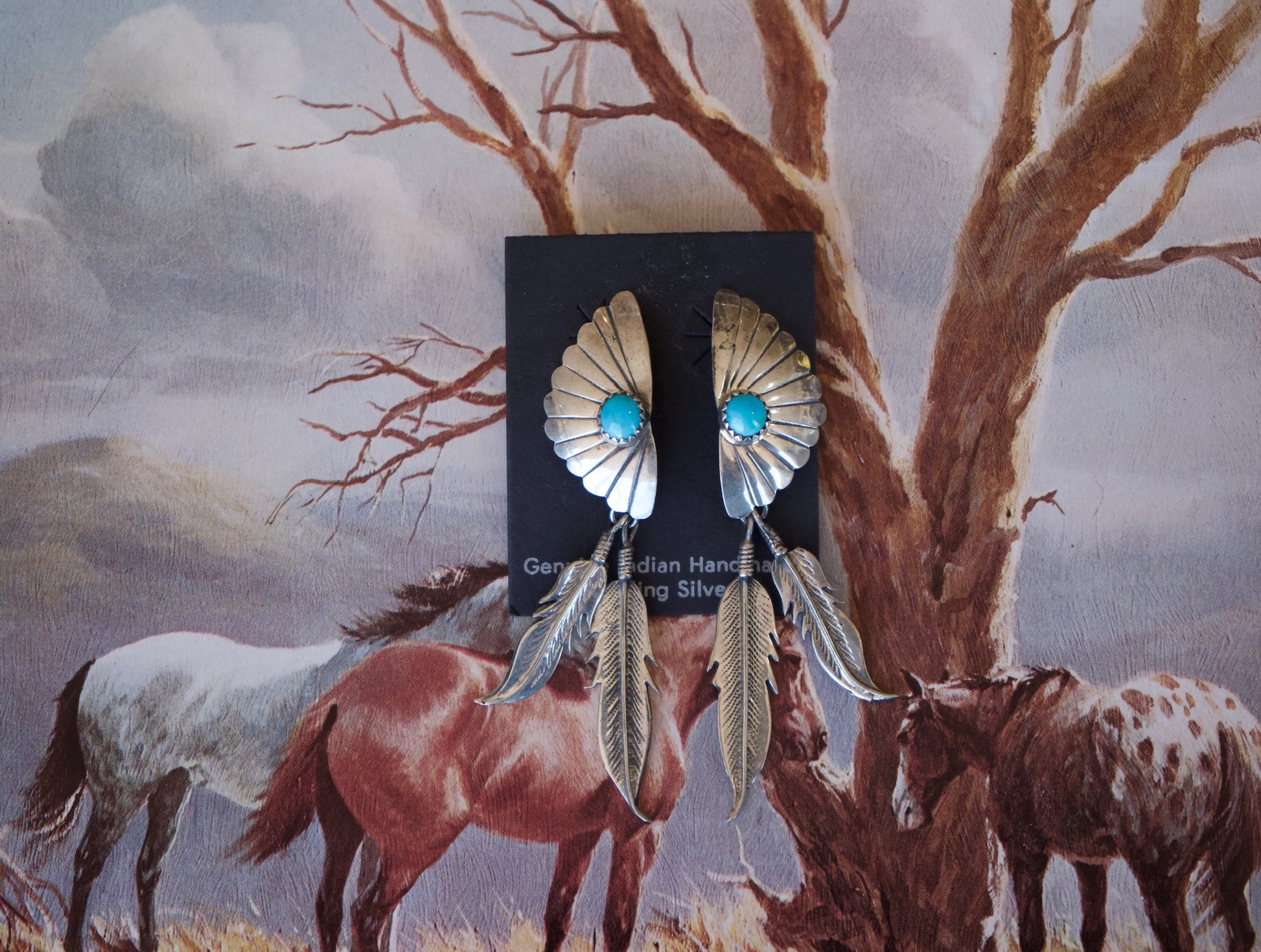 Half Circle Turquoise Post Studs w/ Feather Dangles