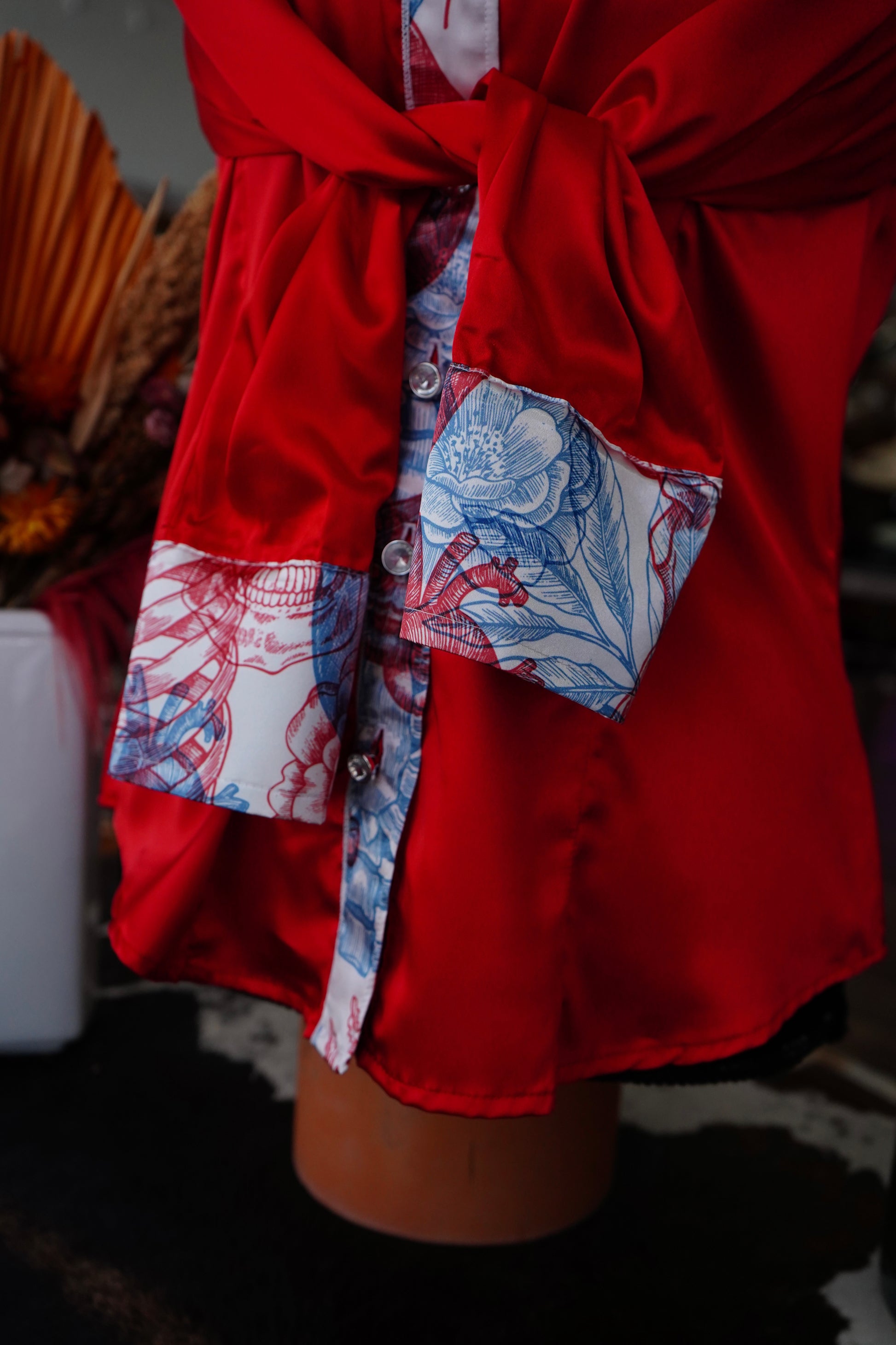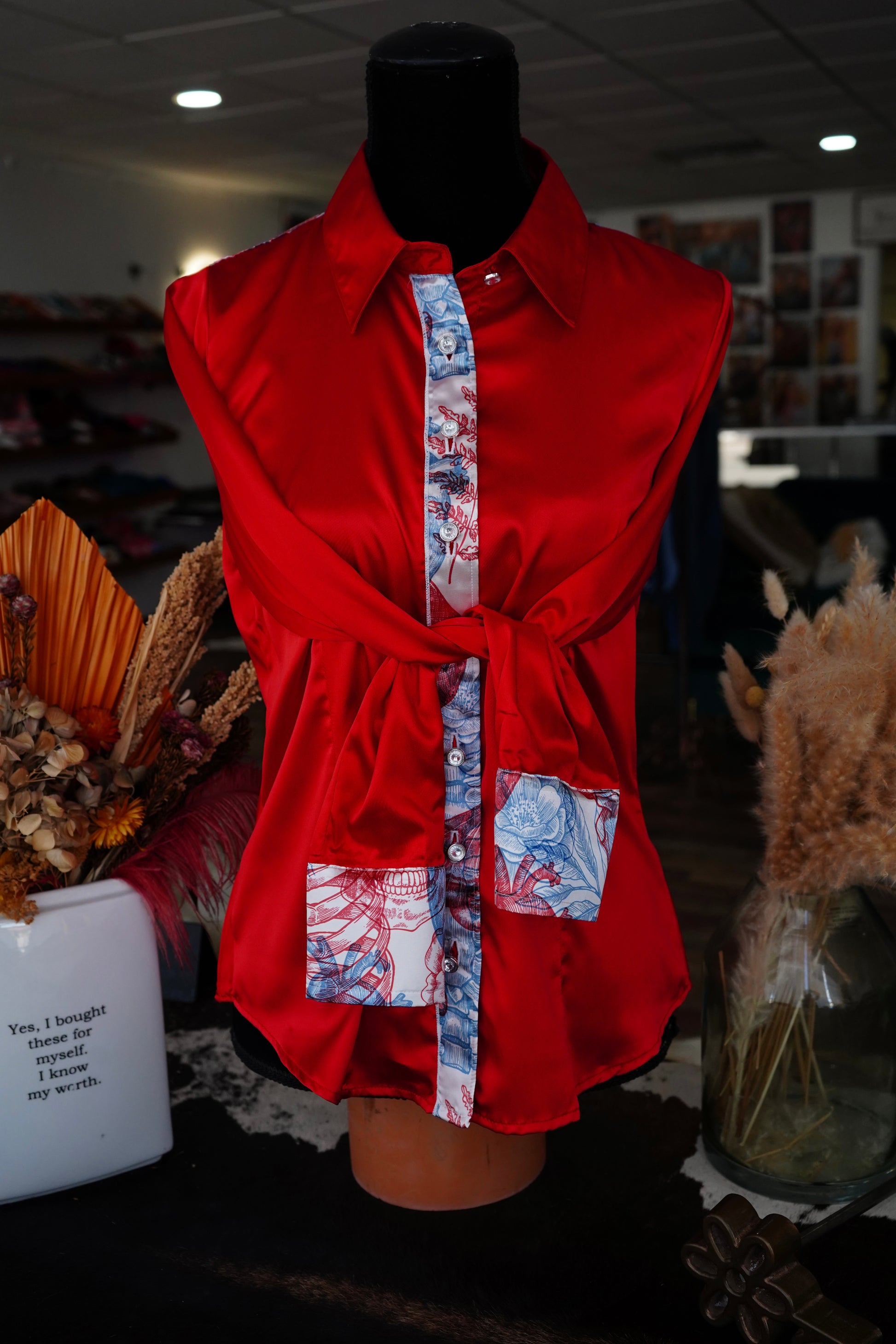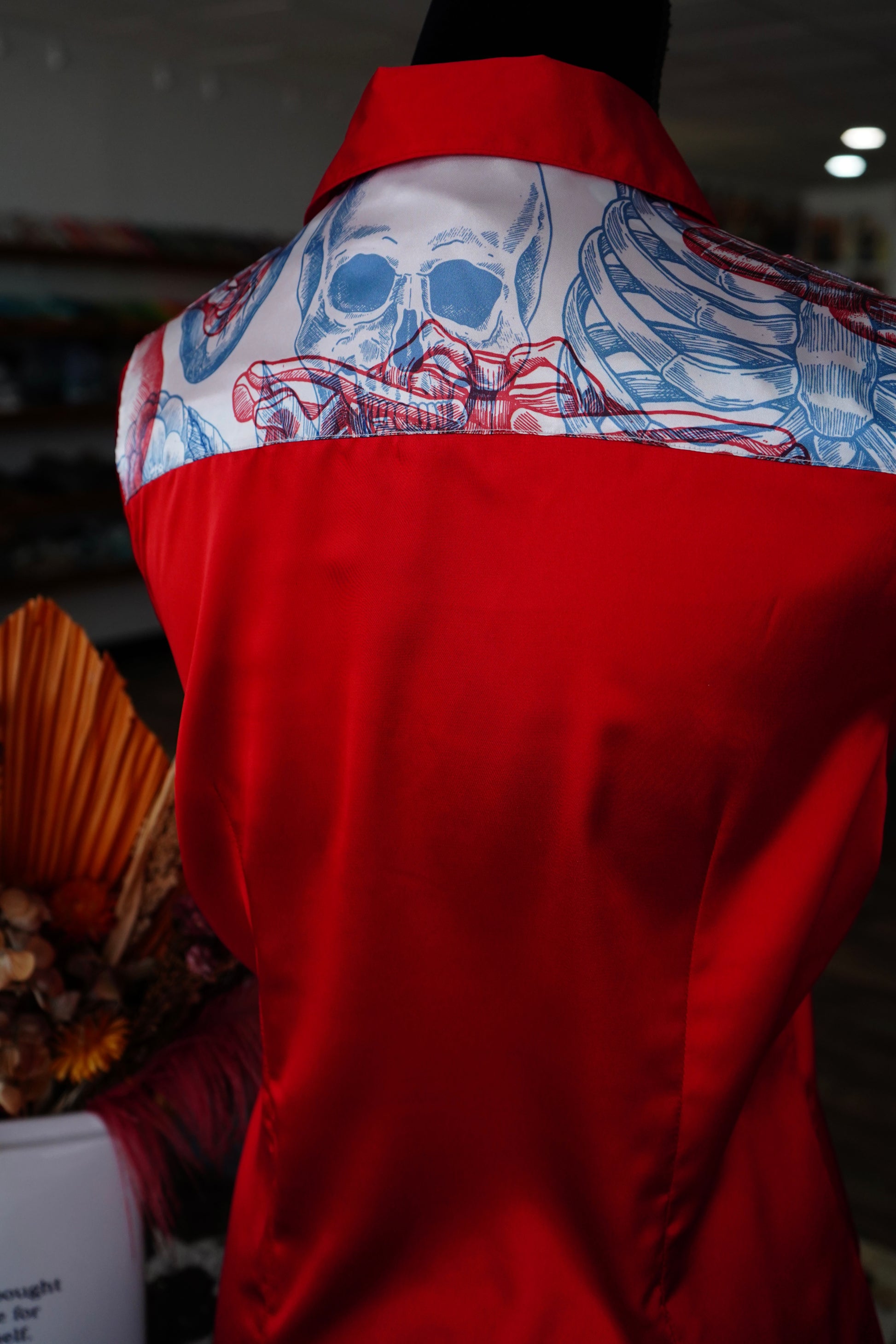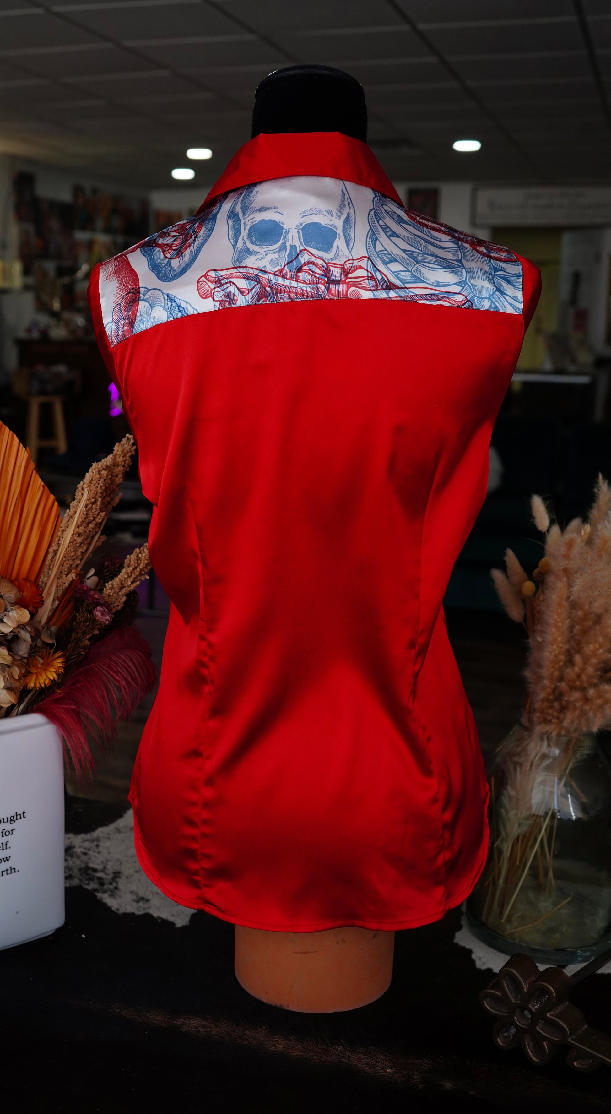 L - Red Satin w/ Patriotic Skulls n Flowers Button Down