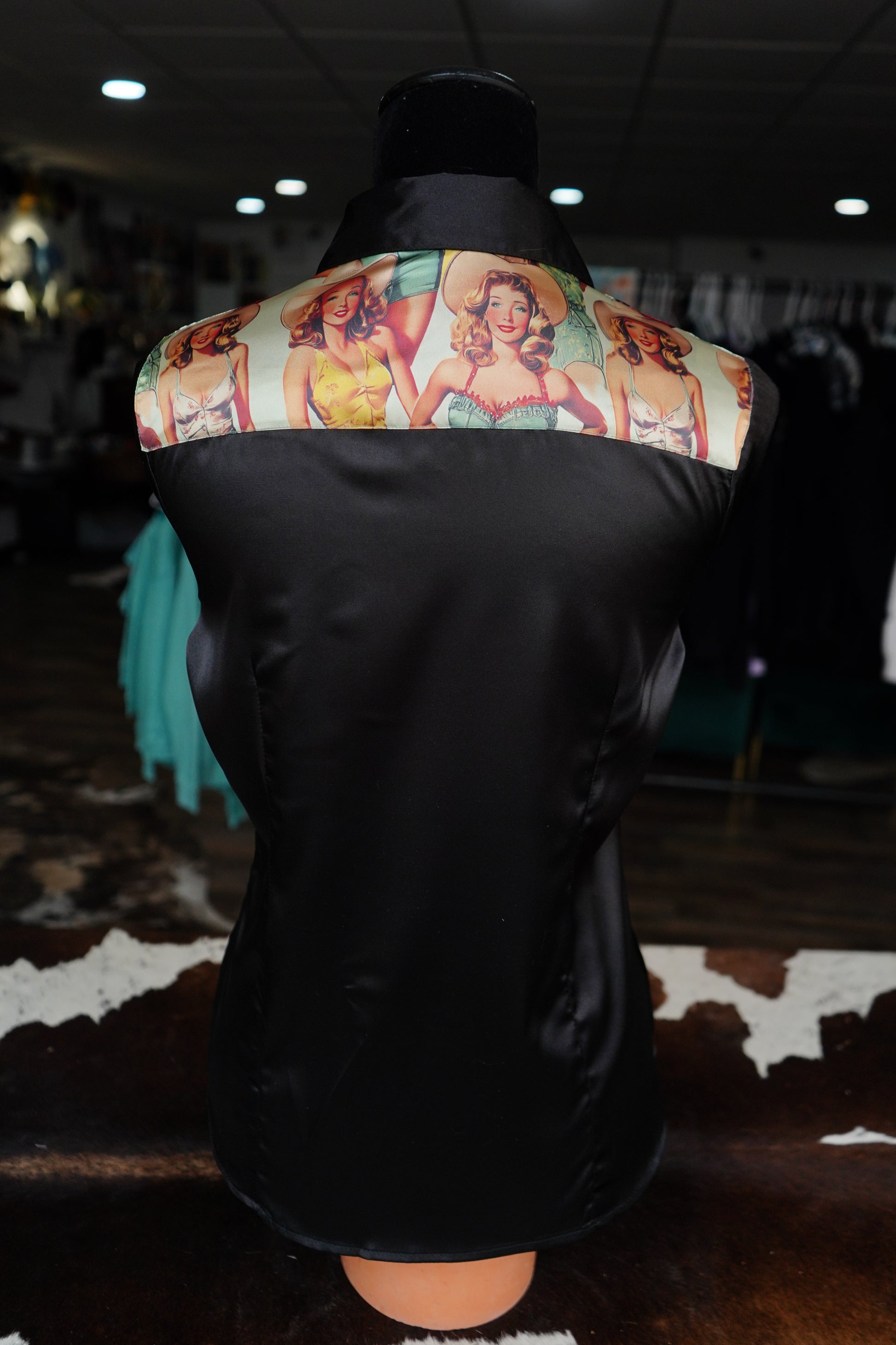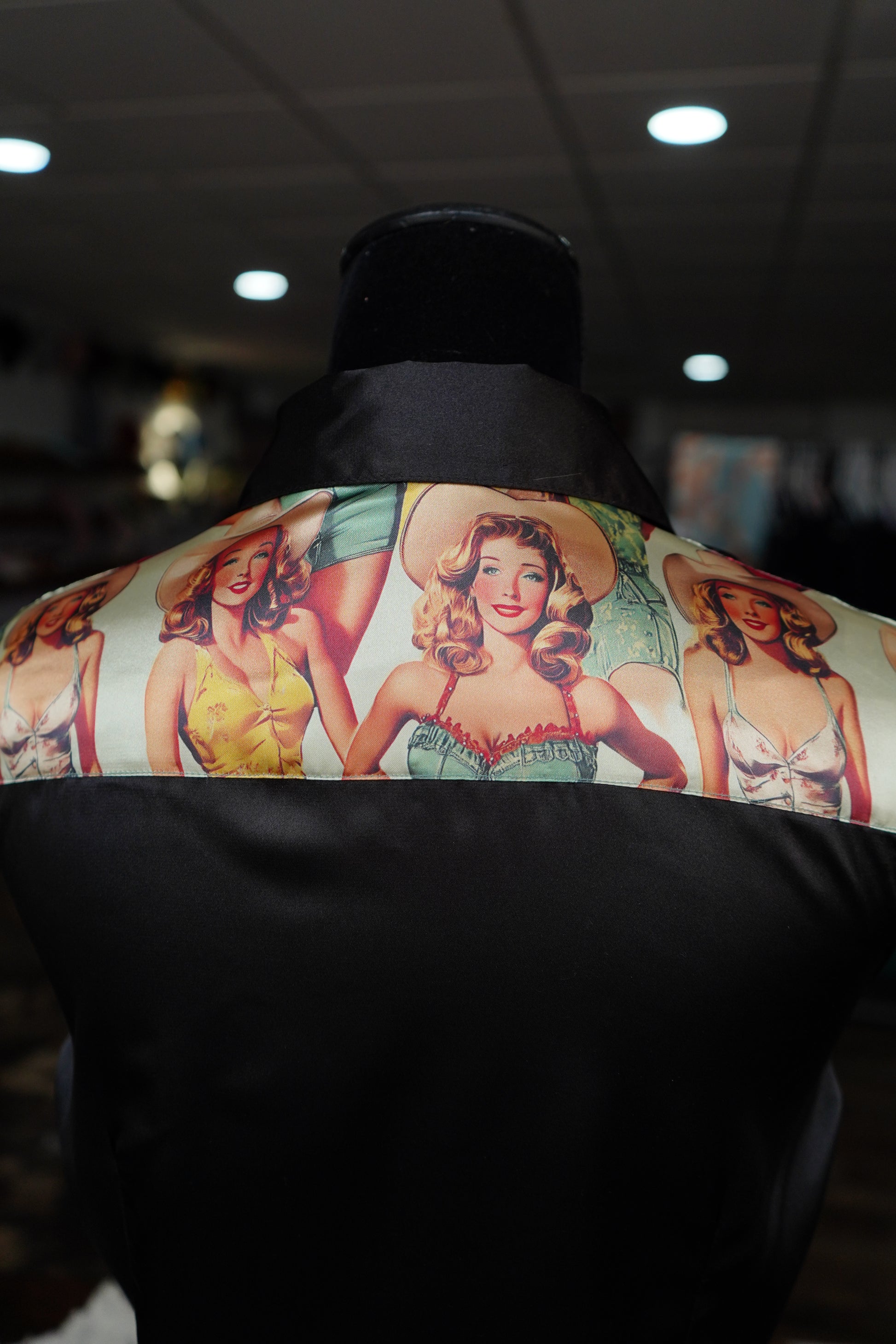 L - Sage Pinup Cowgals on Black Satin Button Down