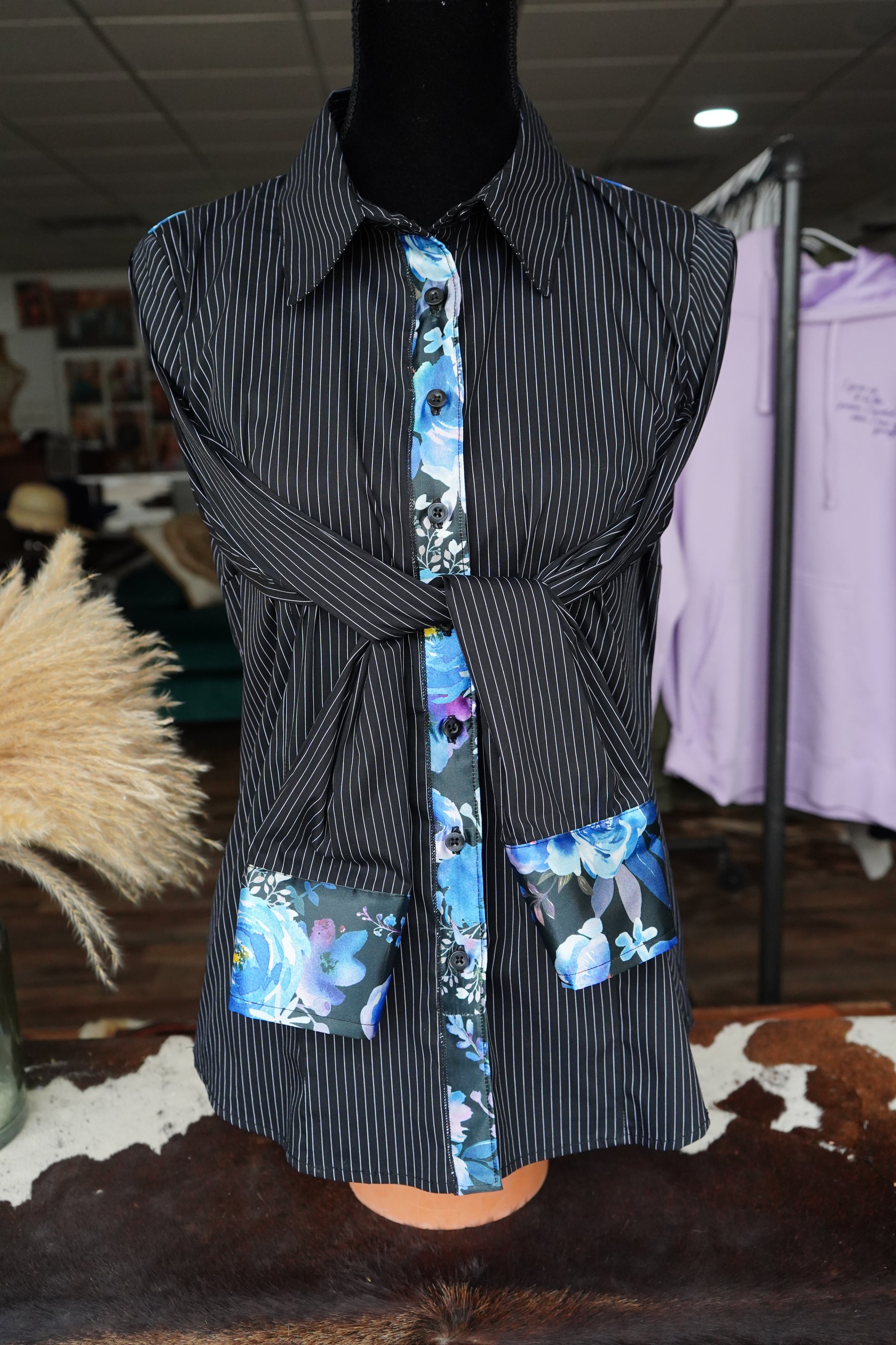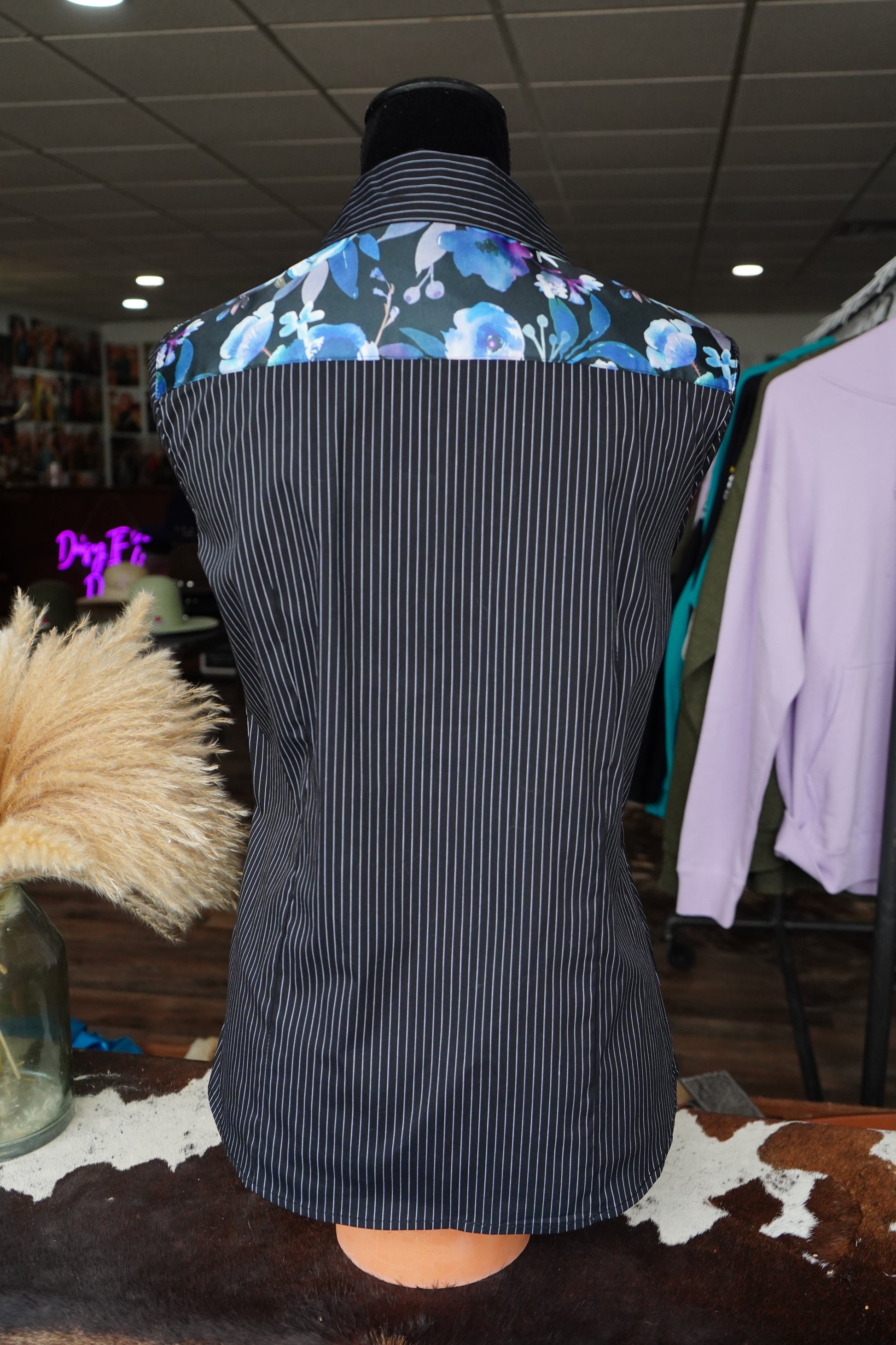 L - Watercolor Blue Floral on B/W Striped Cotton Button Down