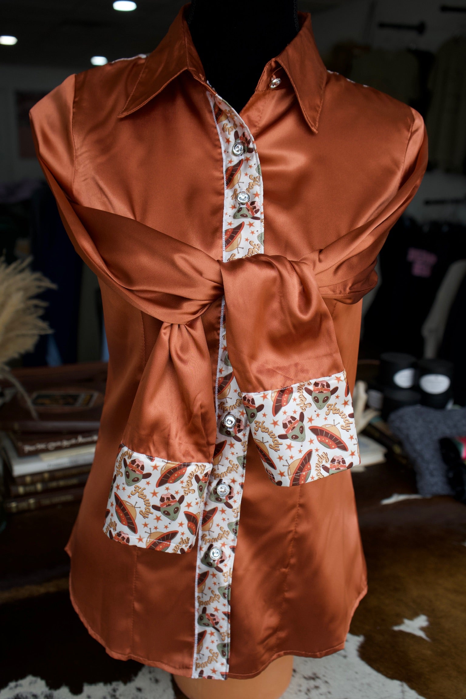 S - Aliens Flyin’ High on Rust Satin Button Down