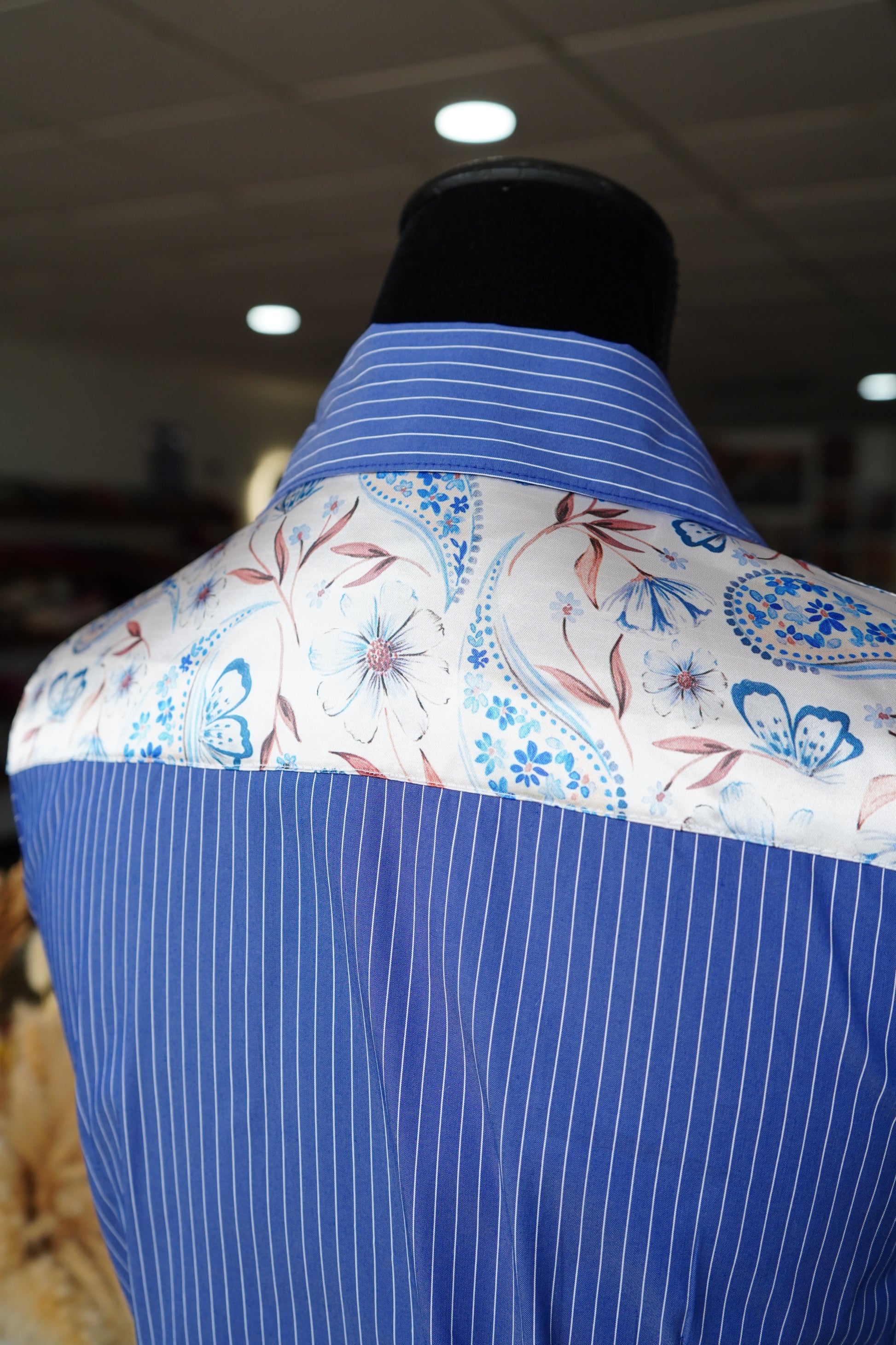 S - Rust Floral Paisley on Denim & White Striped Button Down