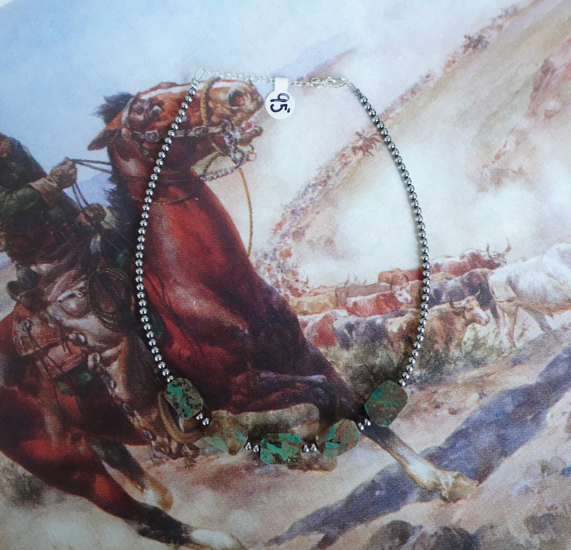 Sterling Silver Pearls w/ Green Turquoise Squares Necklace