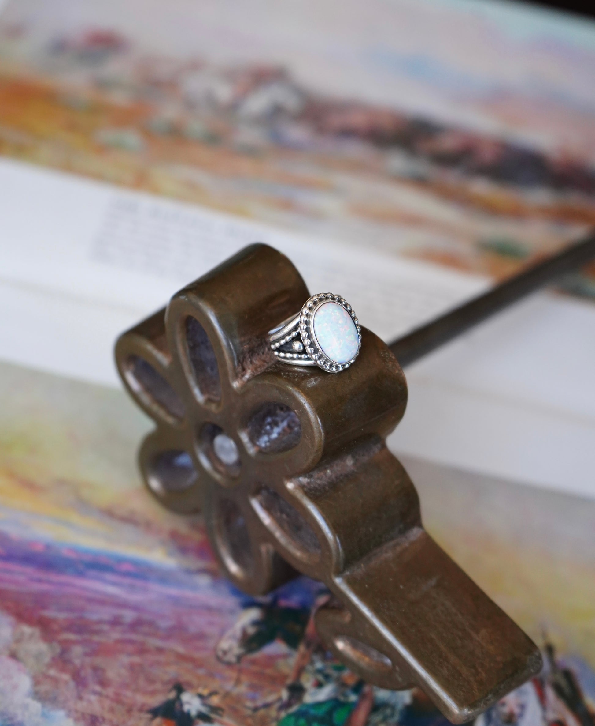 Thomas Yazzie White Opal w/ Beaded Band Ring - Sz 6