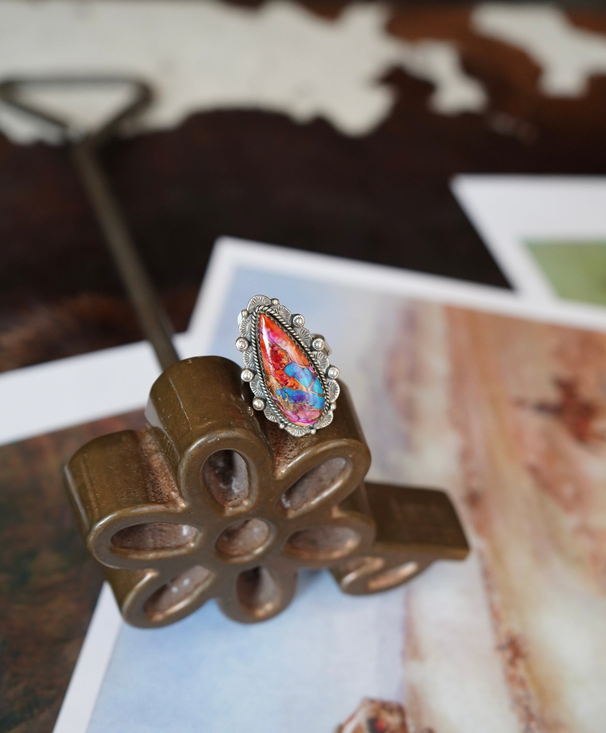 Turquoise Teardrop w/ Bead Border Rings - Adj
