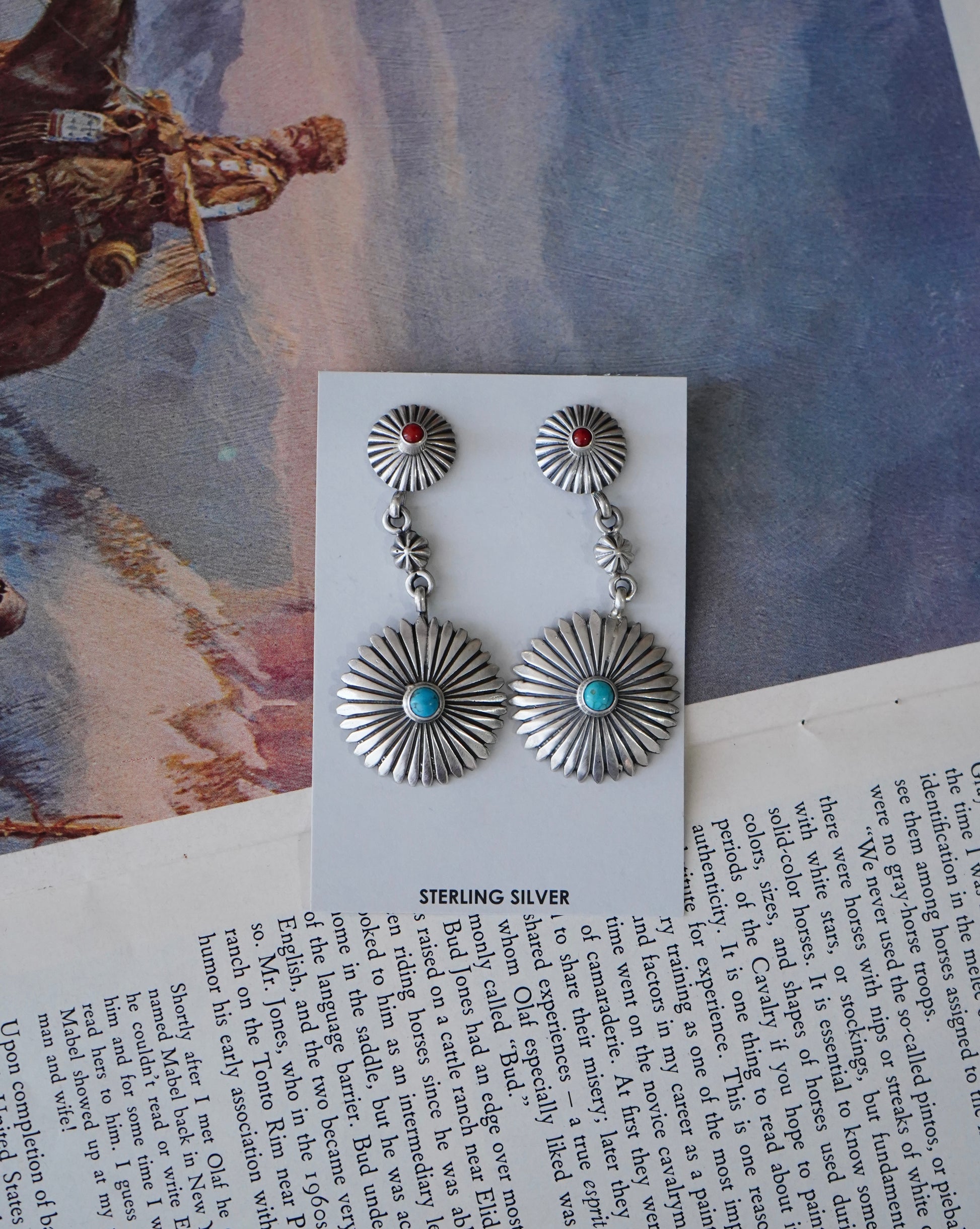 Verley Betone Zuni Turquoise & Red Coral Dangly Concho Stud Earrings