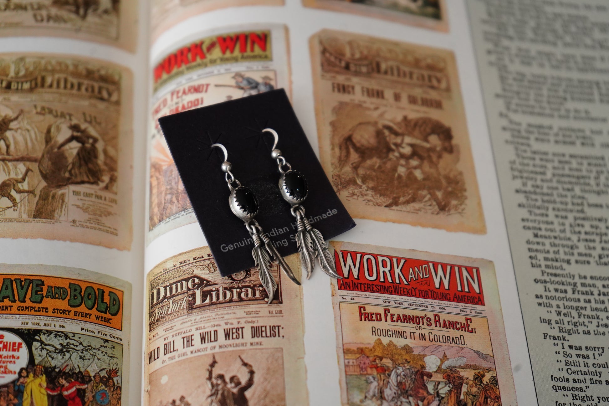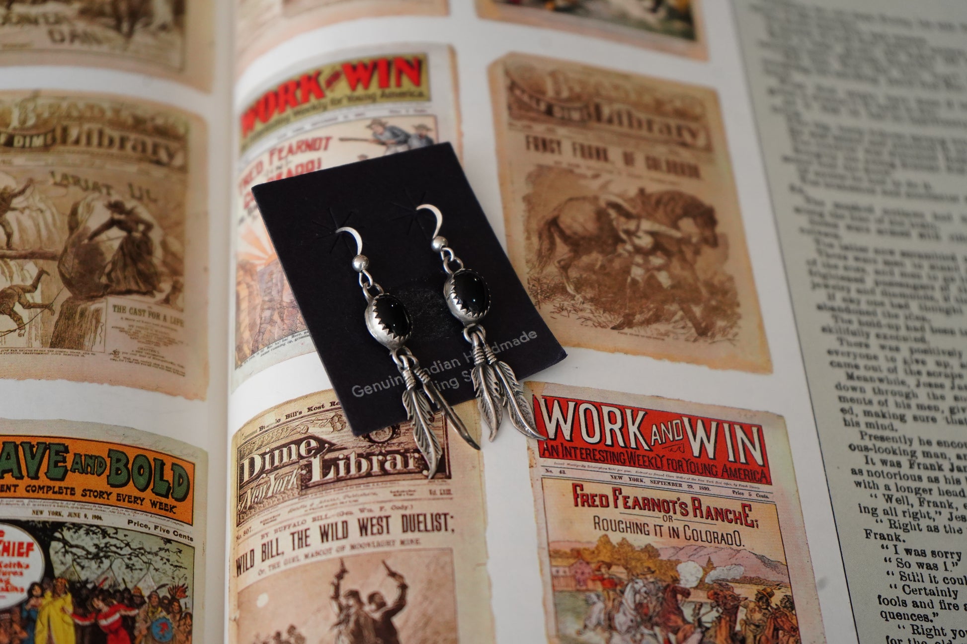 Vintage Black Onyx w/ Dangly Feathers Fish Hook Earrings