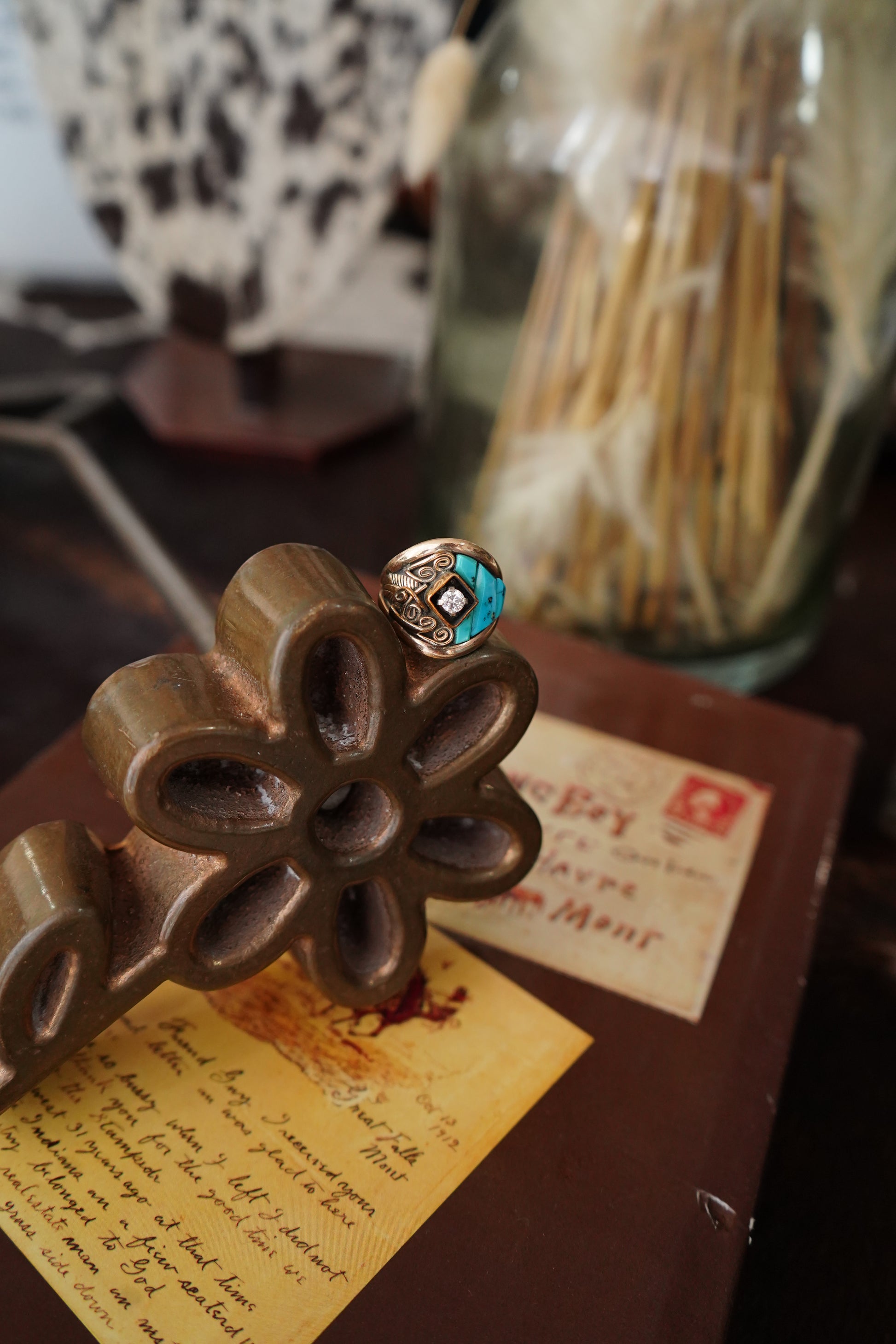 Vintage Gold & Turquoise Ring w/ CZ - Sz 8.75