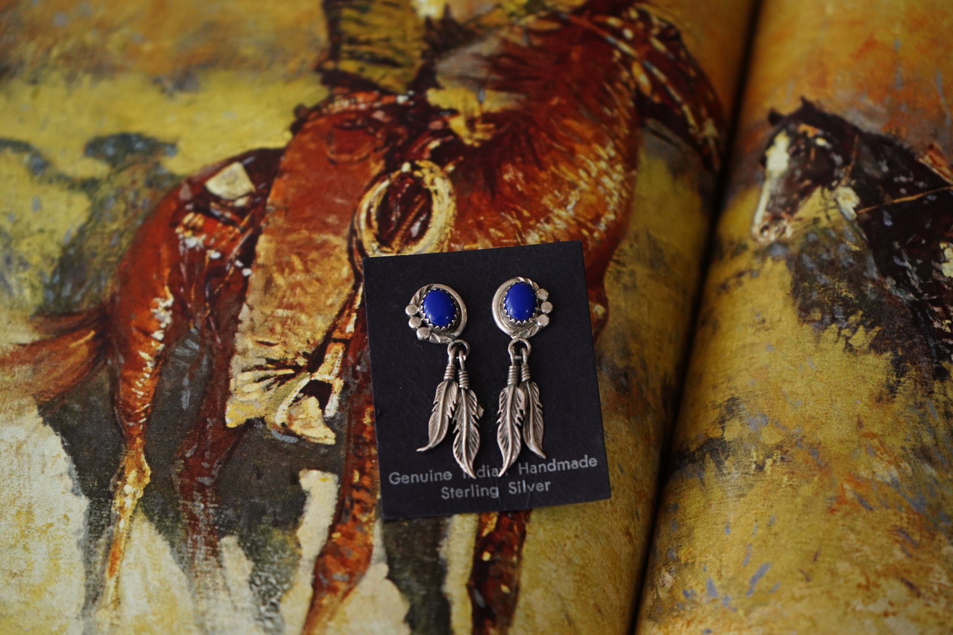 Vintage Lapis Lazuli Stud Earrings w/ Silver Feather Dangles