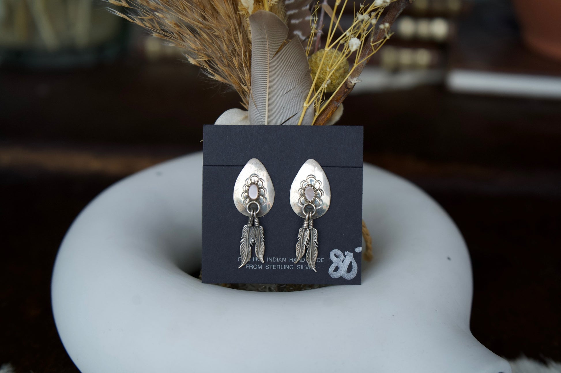 Vintage Mother of Pearl Sterling Silver Feather Dangles Post Earrings