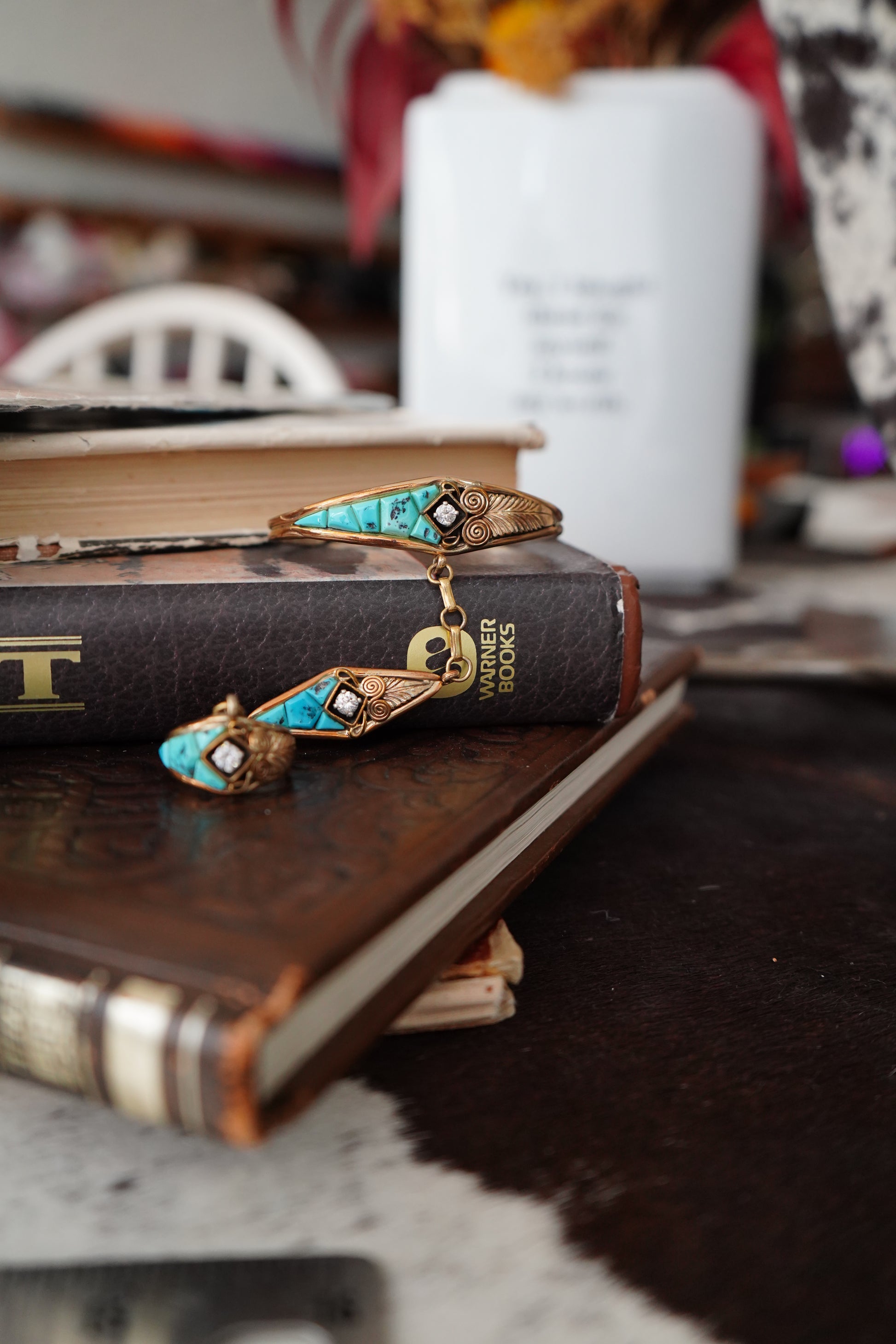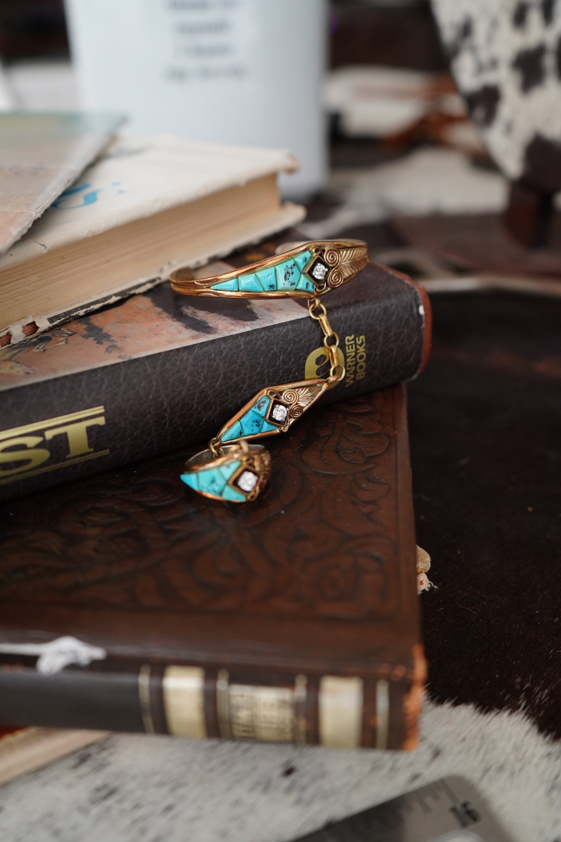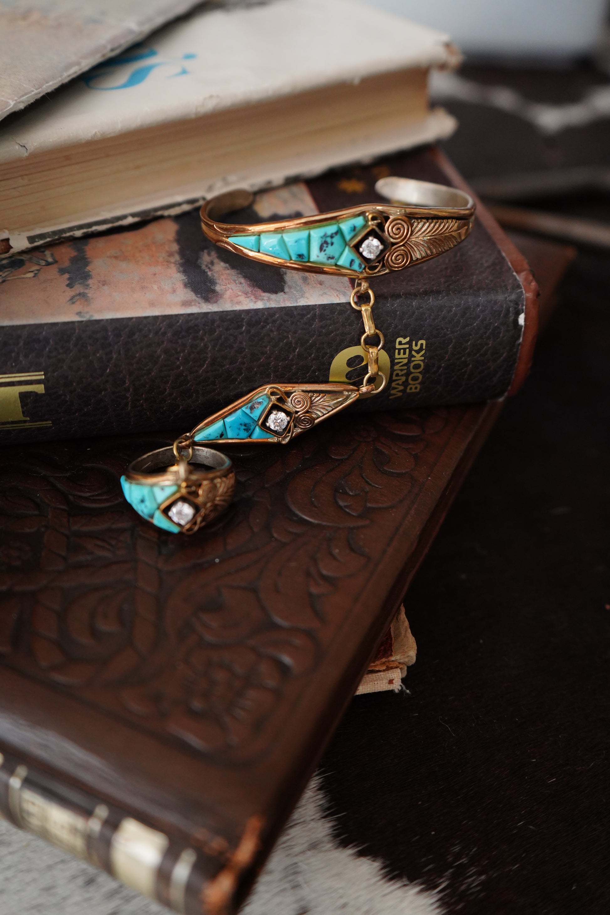 Vintage Turquoise, Gold & CZ Lariat Bracelet - Sz 8.5