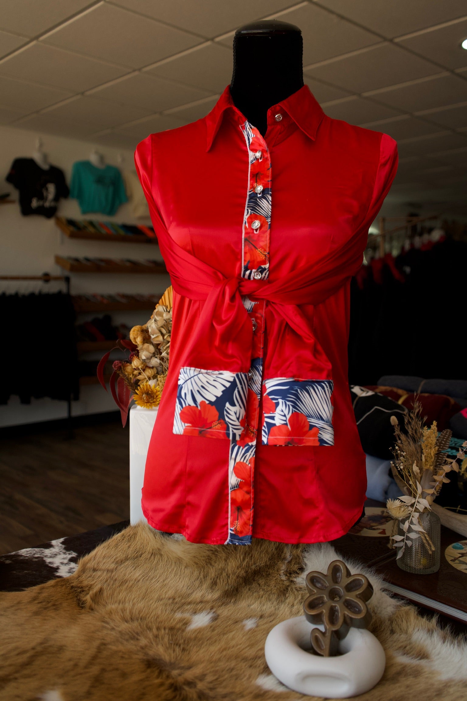 XL - Patriotic Hibiscus on Red Satin Button Down